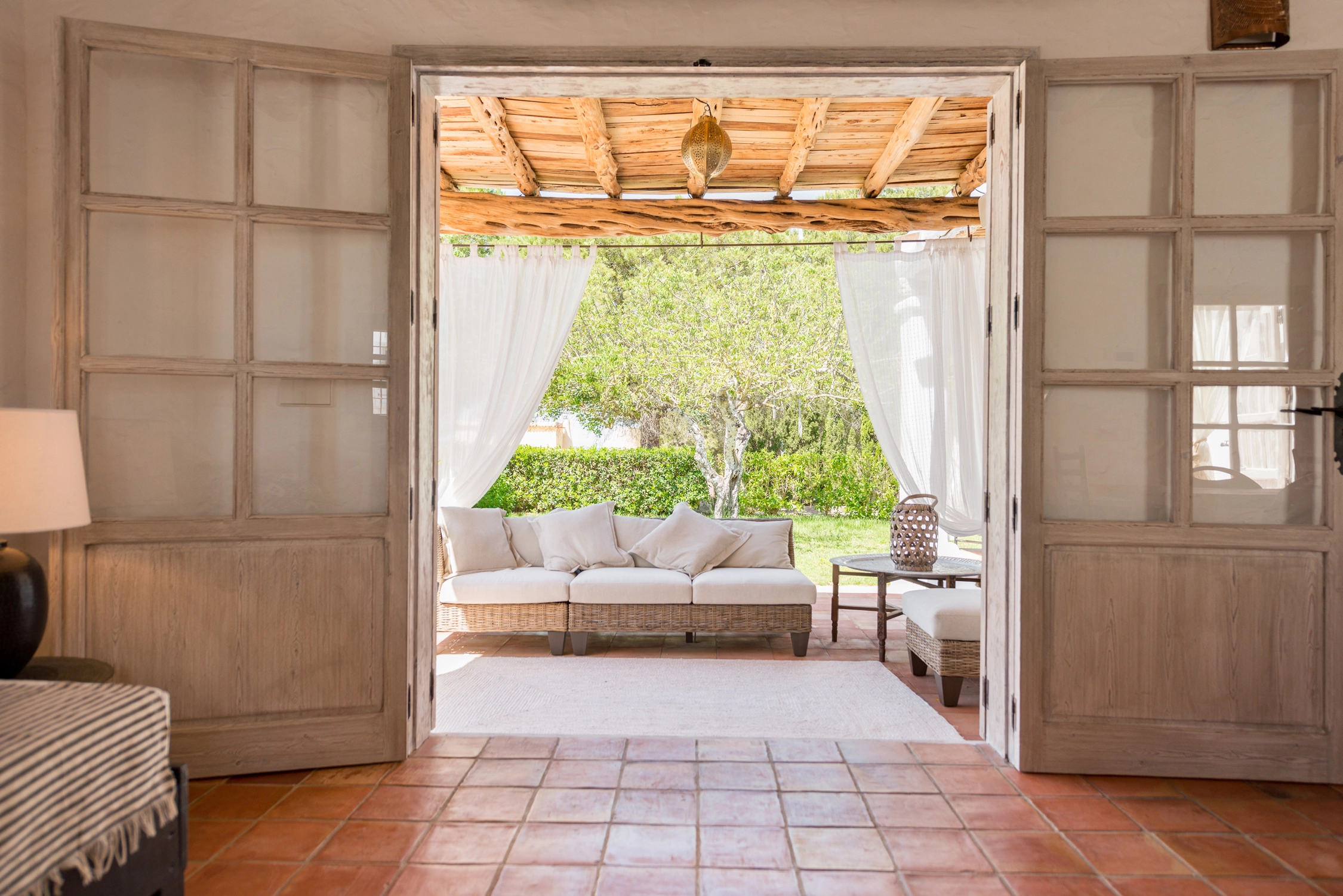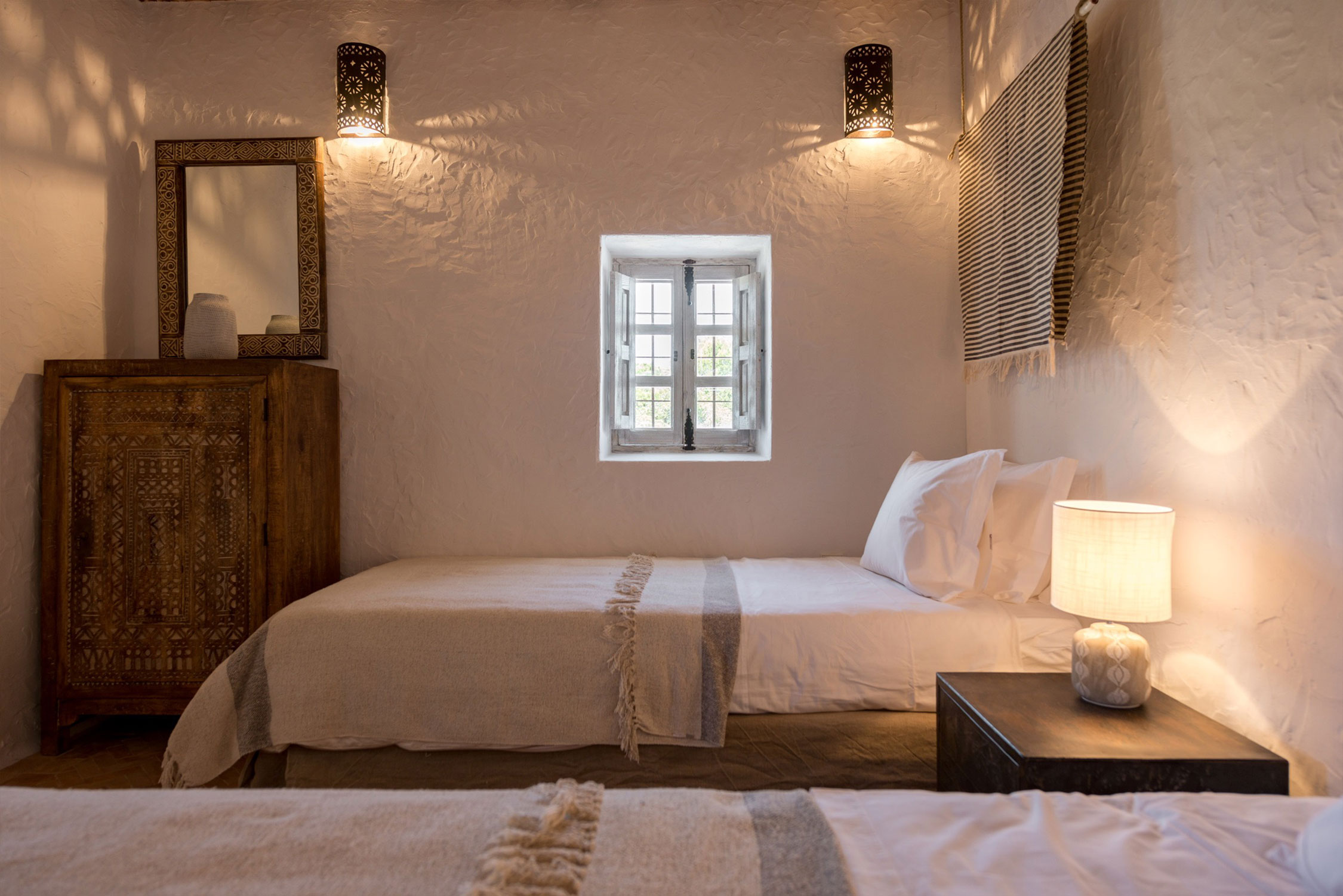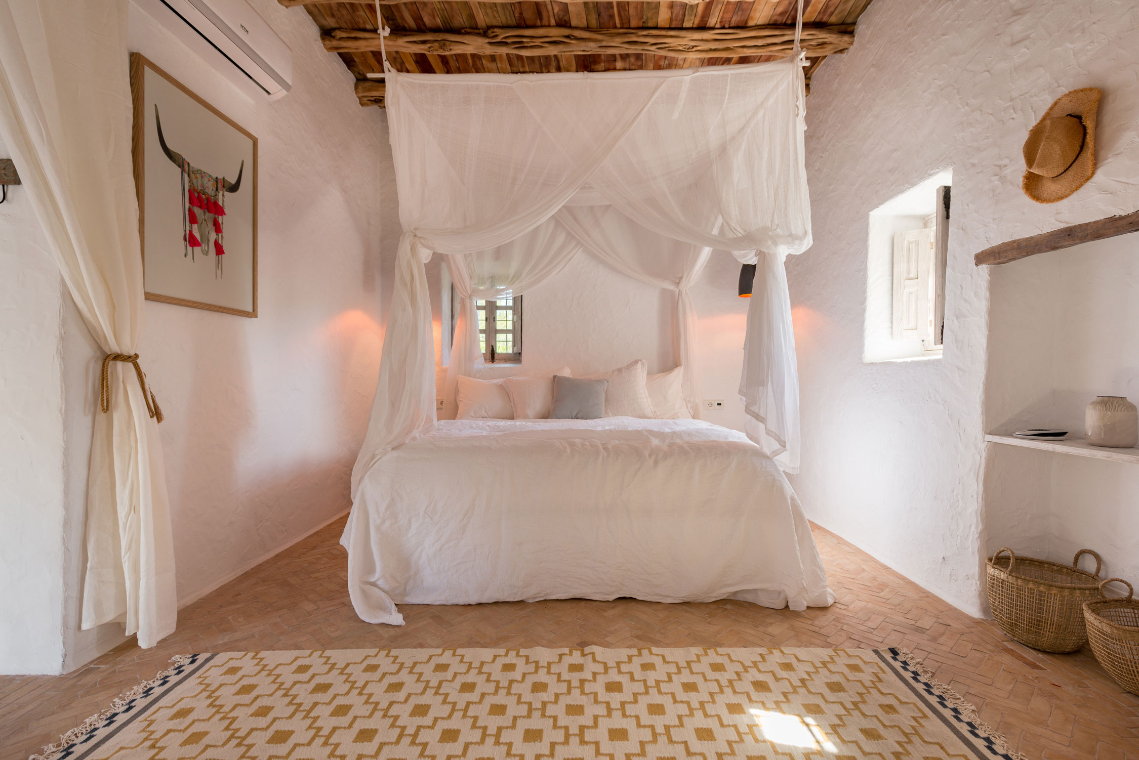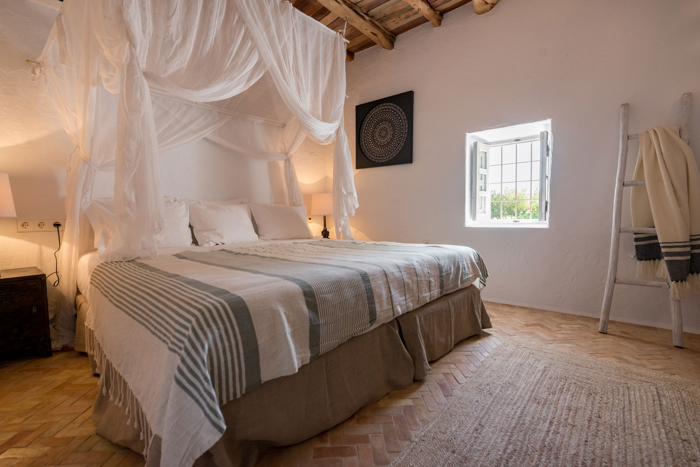 Inside, rustic charm meets modern comfort. The original sabina wood beams and thick stone walls preserve the authentic Ibiza feel, while underfloor heating, air conditioning, and high-quality king-size beds ensure a luxurious stay. Carefully selected furniture from Bali, India, and Morocco adds an elegant, worldly touch.