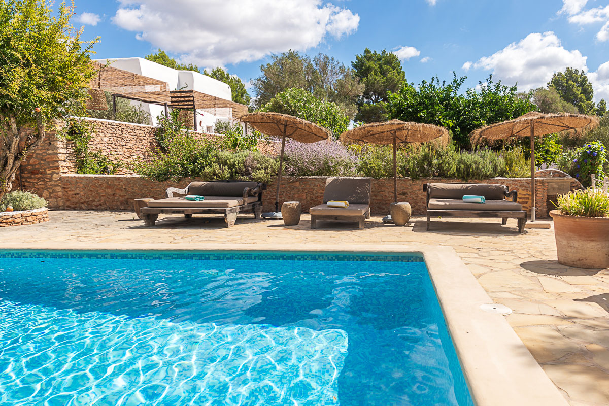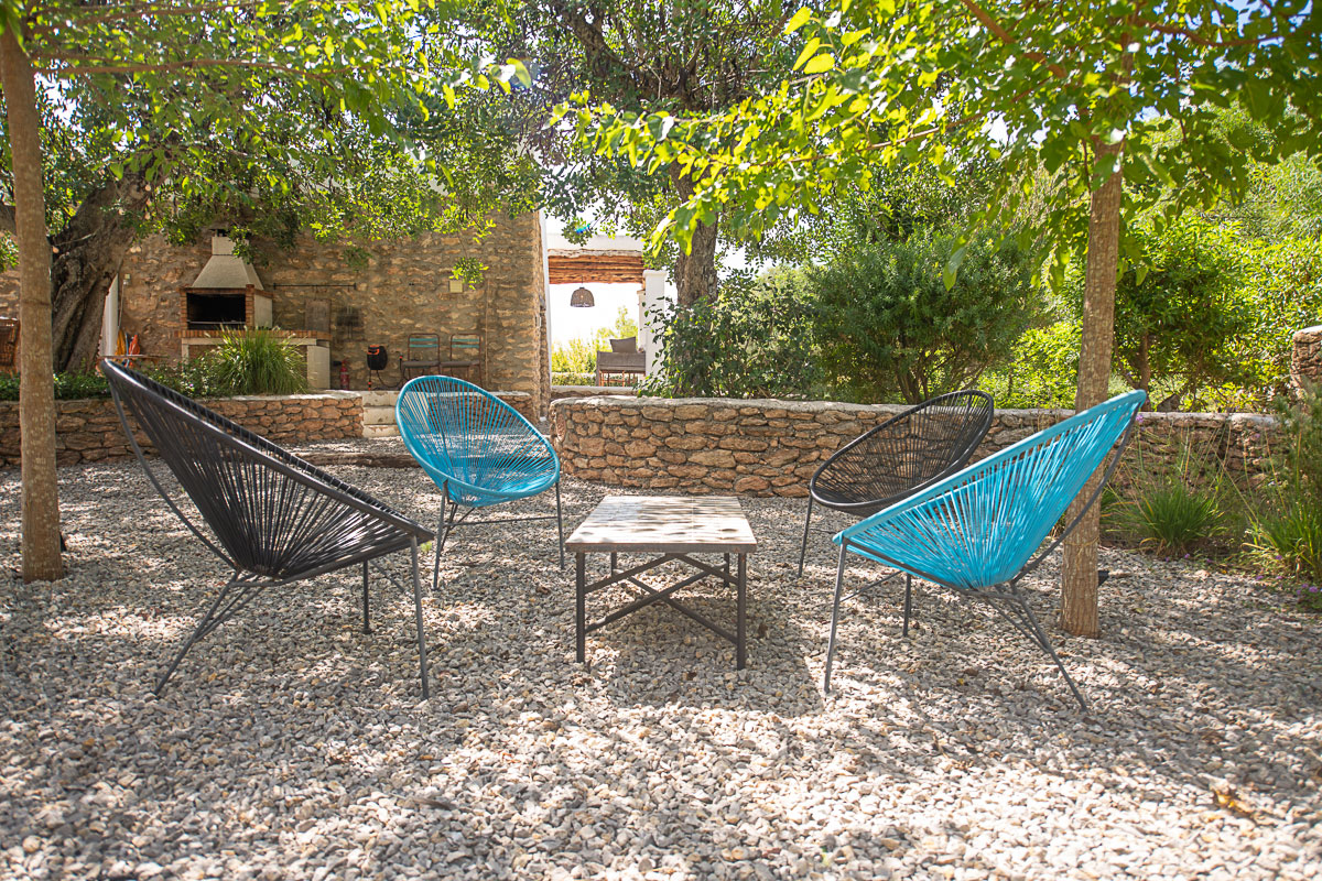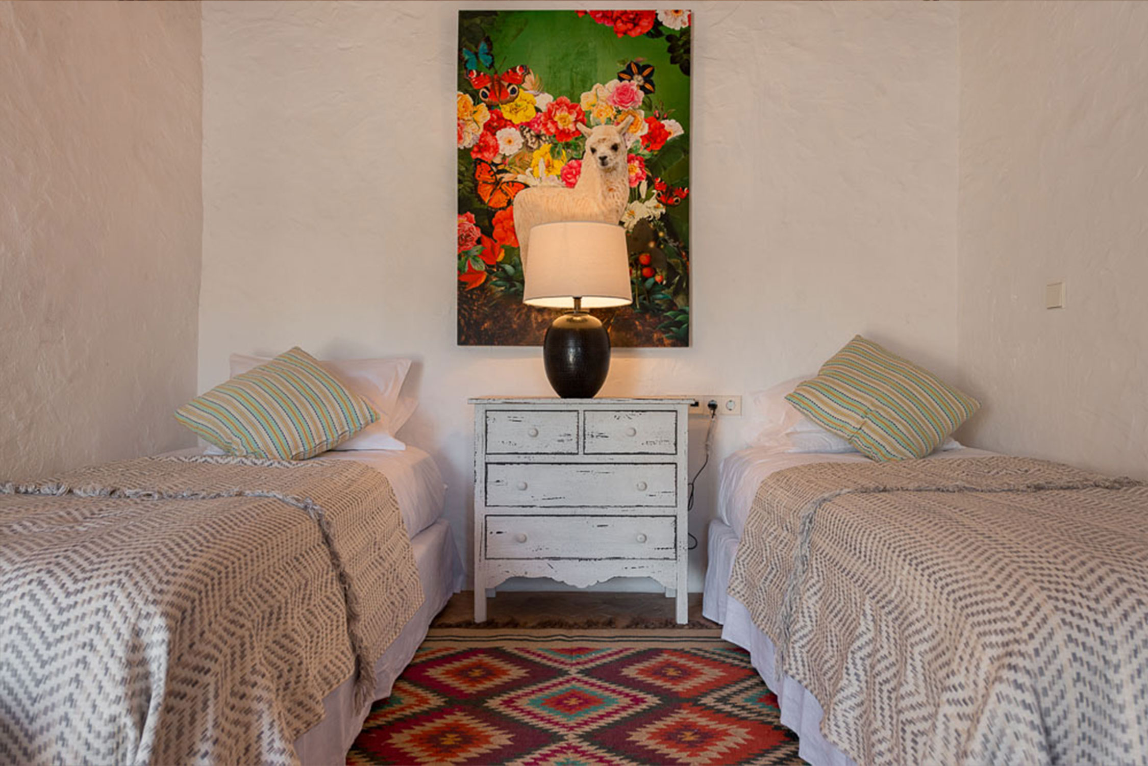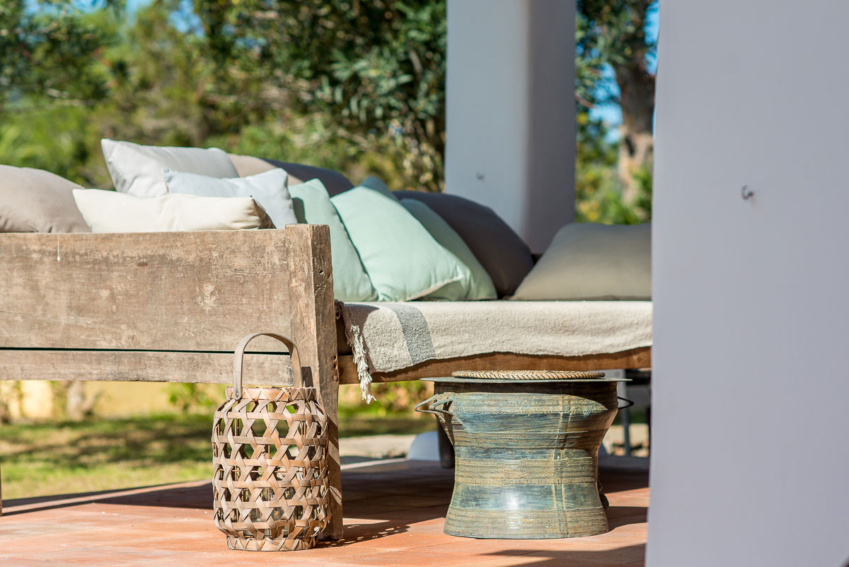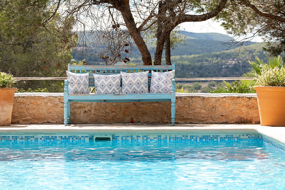 Inside, rustic charm meets modern comfort. The original sabina wood beams and thick stone walls preserve the authentic Ibiza feel, while underfloor heating, air conditioning, and high-quality king-size beds ensure a luxurious stay. Carefully selected furniture from Bali, India, and Morocco adds an elegant, worldly touch.