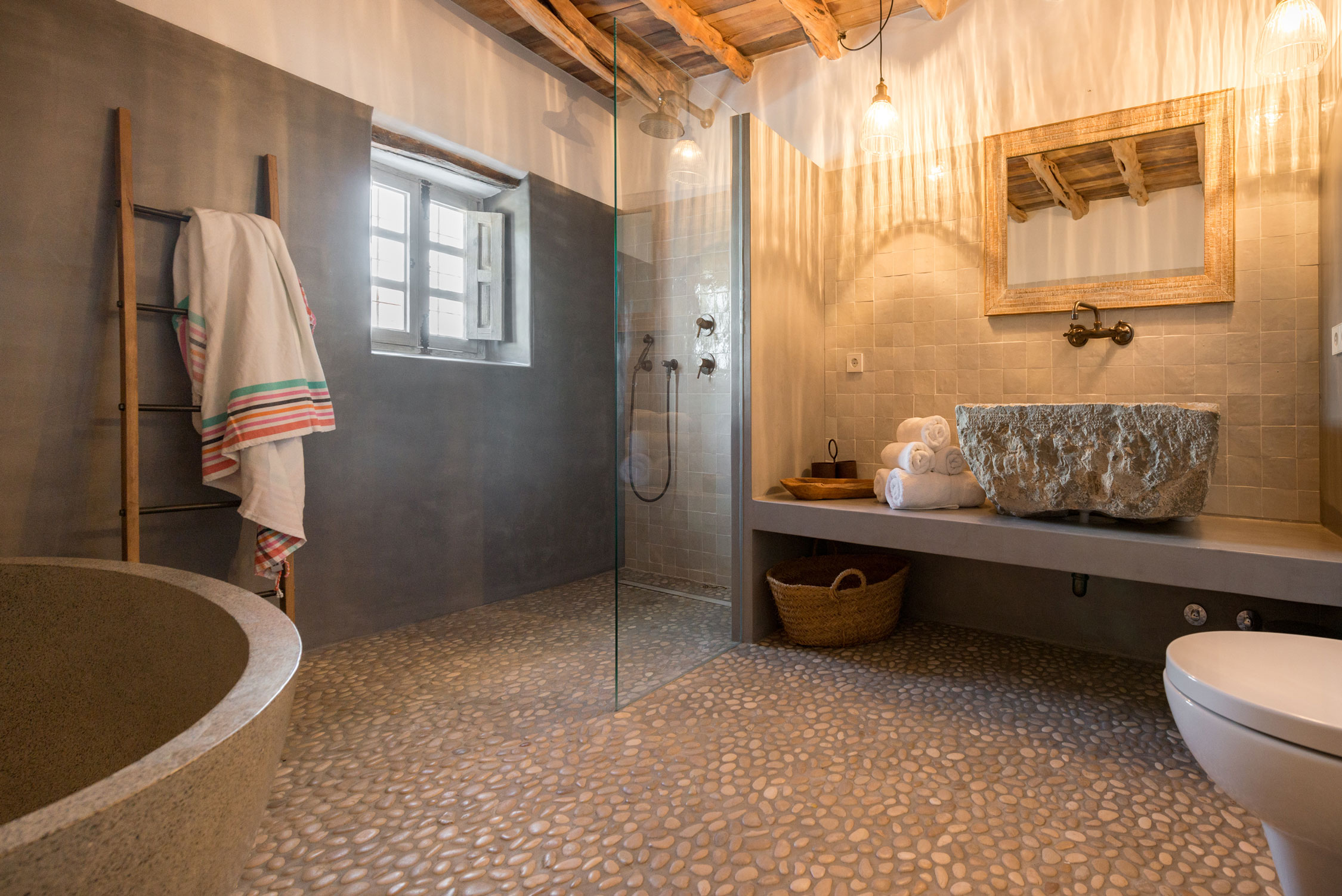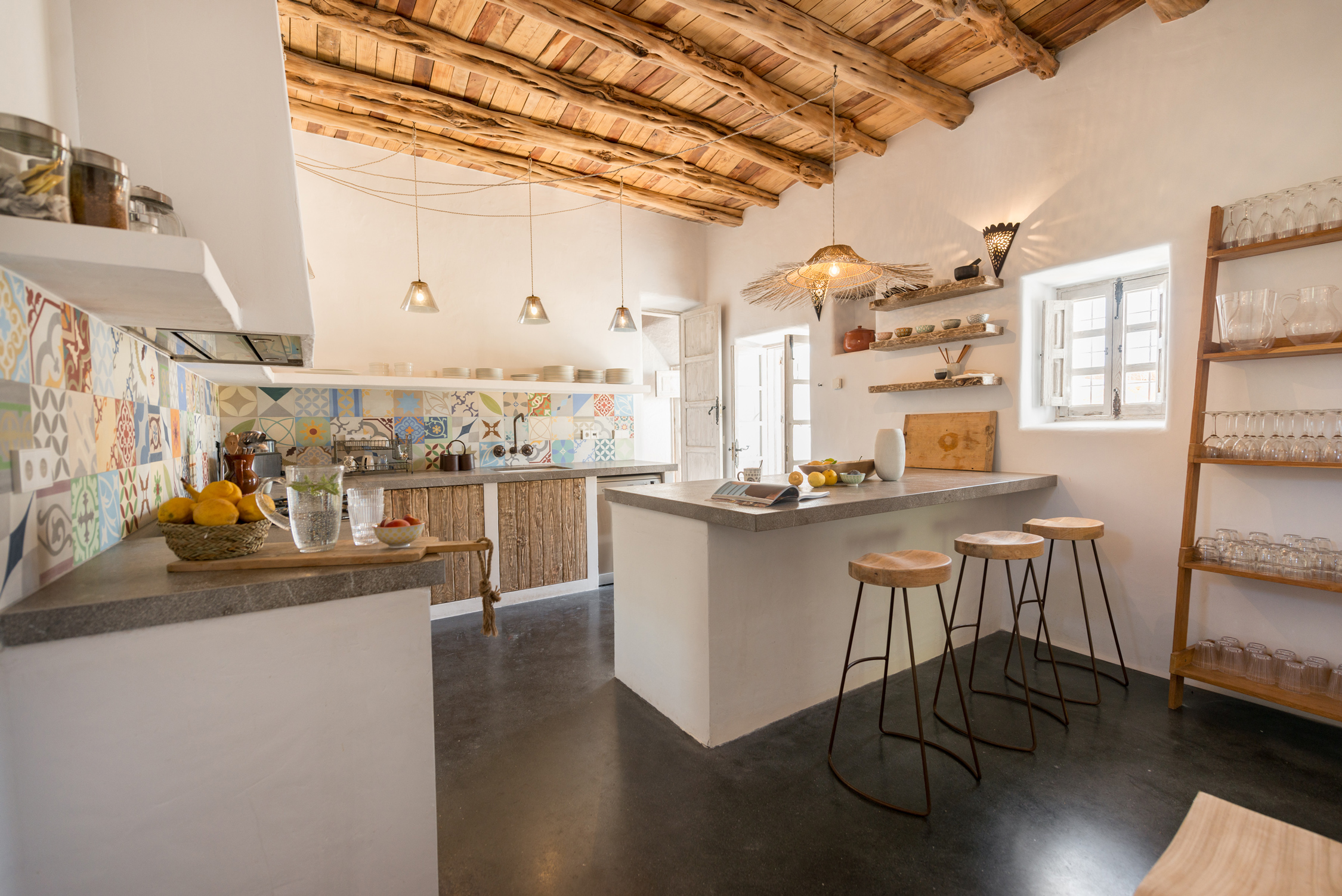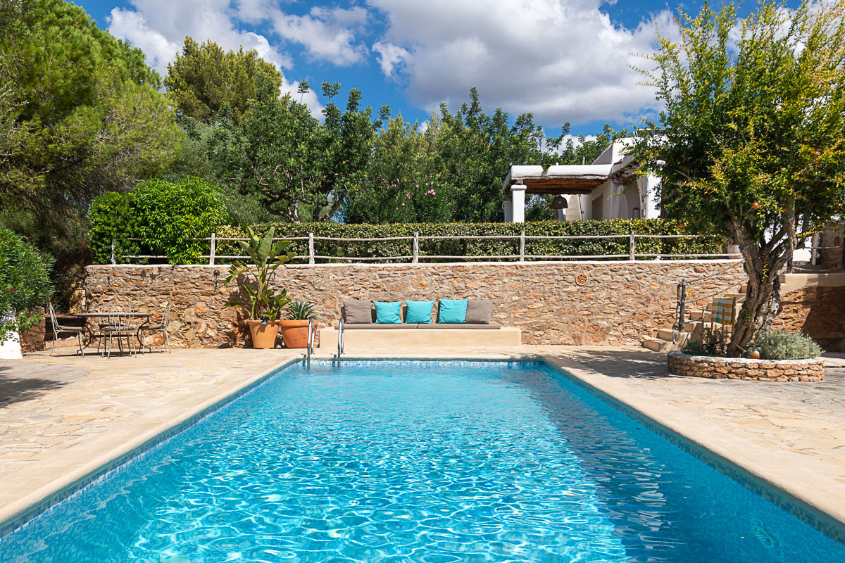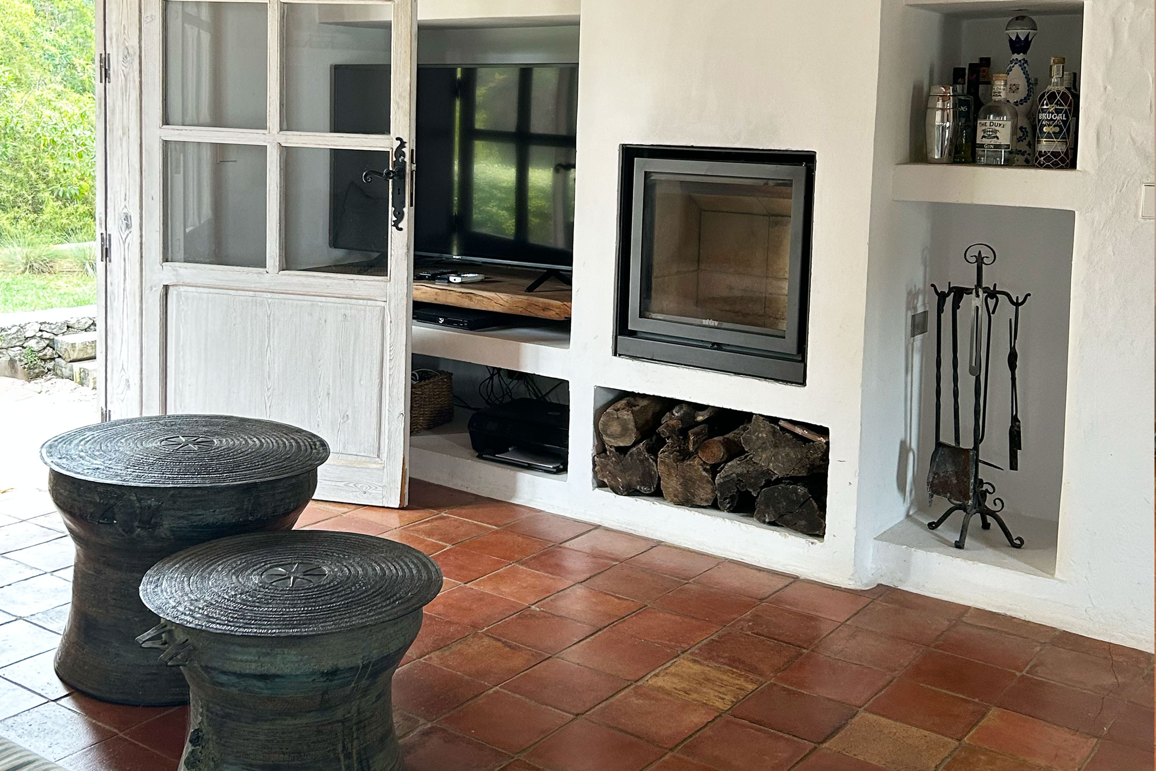 Inside, rustic charm meets modern comfort. The original sabina wood beams and thick stone walls preserve the authentic Ibiza feel, while underfloor heating, air conditioning, and high-quality king-size beds ensure a luxurious stay. Carefully selected furniture from Bali, India, and Morocco adds an elegant, worldly touch.